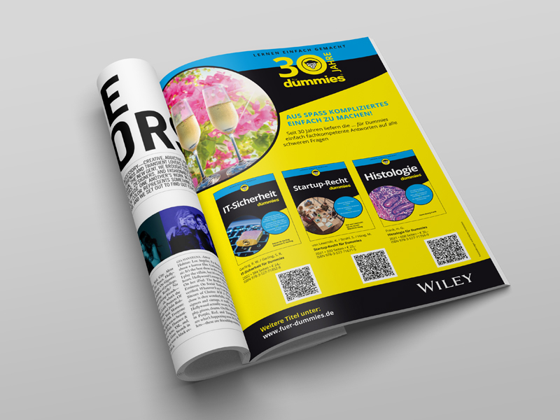 Von der halbjährlich erscheinenden Vorschau über Anzeigen, Internetbanner, Flyer, Giveaways bis hin zu Aufstellern, Poster und allem, was am POS benötigt wird, seit 20 Jahren unterstütze ich die Reihe ... für Dummies mit der Gestaltung von Werbemaßnahmen. Gelb, auffällig und präsent.